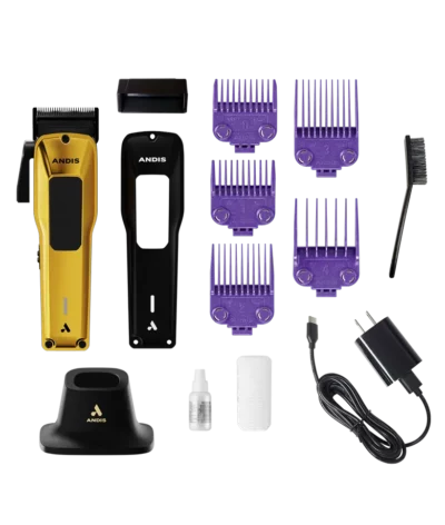 Clipper comes equipped with gold cover and black textured grip, secondary black cover and white textured grip, 5 dual-magnetic attachment combs (#0 – 1/16″, 1# – 1/8″, #2 – 1/4″, #3 – 3/8″, #4 – 1/2″), blade cleaning brush, premium charging stand , USB-C charging adapter, blade oil and blade guard.